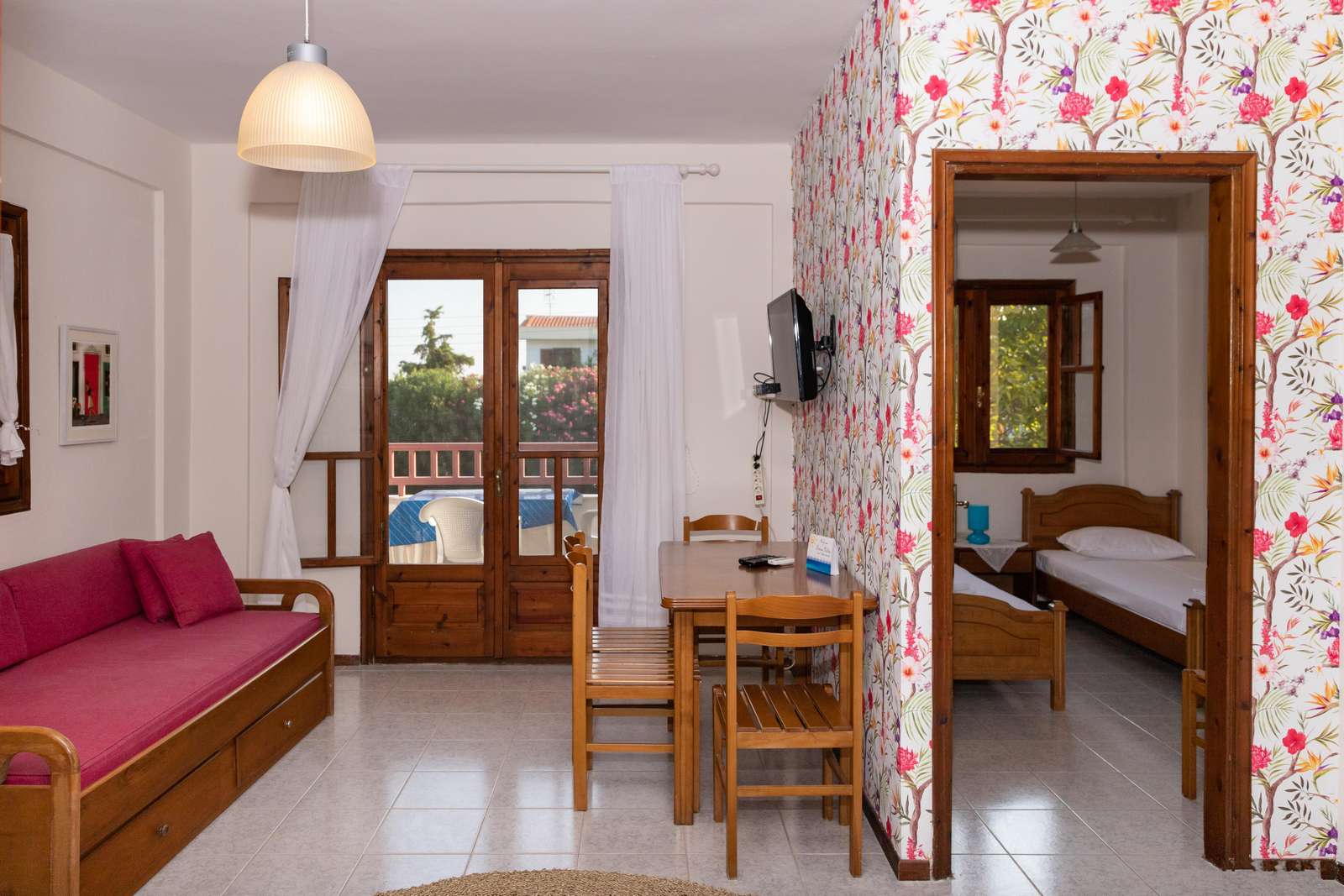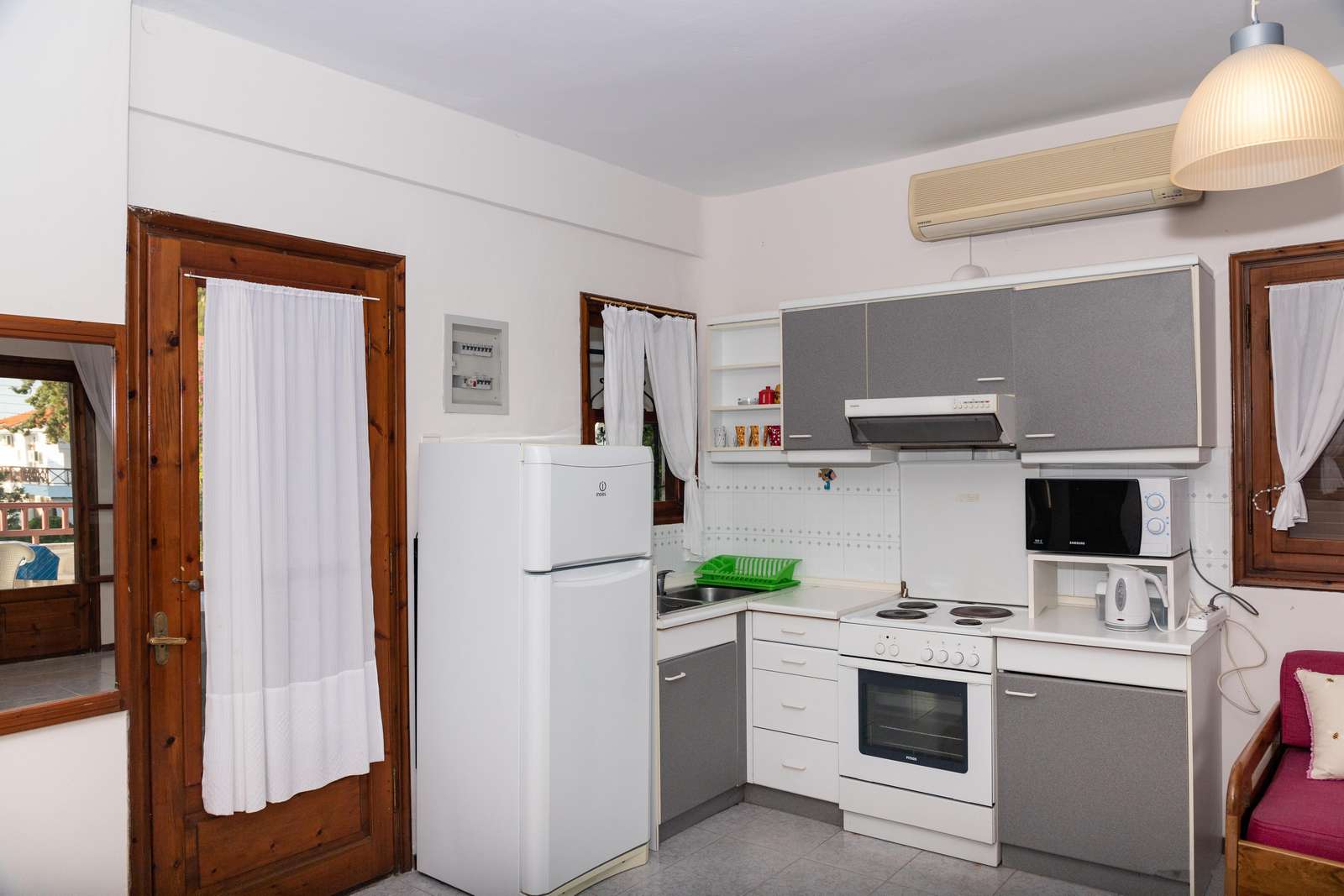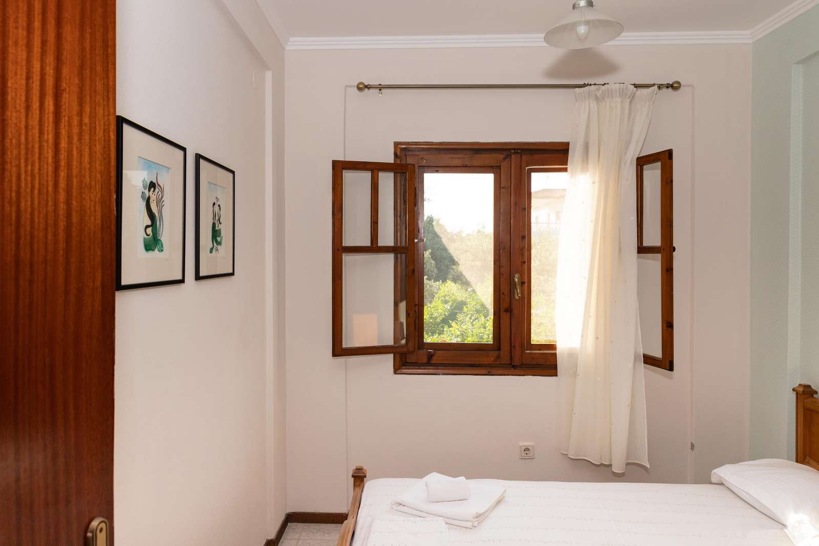 The apartment features two bedrooms, each with comfortable bedding, ample wardrobe space, and tiled floors, ensuring a cool and pleasant environment. The air-conditioning provides a refuge from the warm Greek sun, ensuring your stay is comfortable throughout.