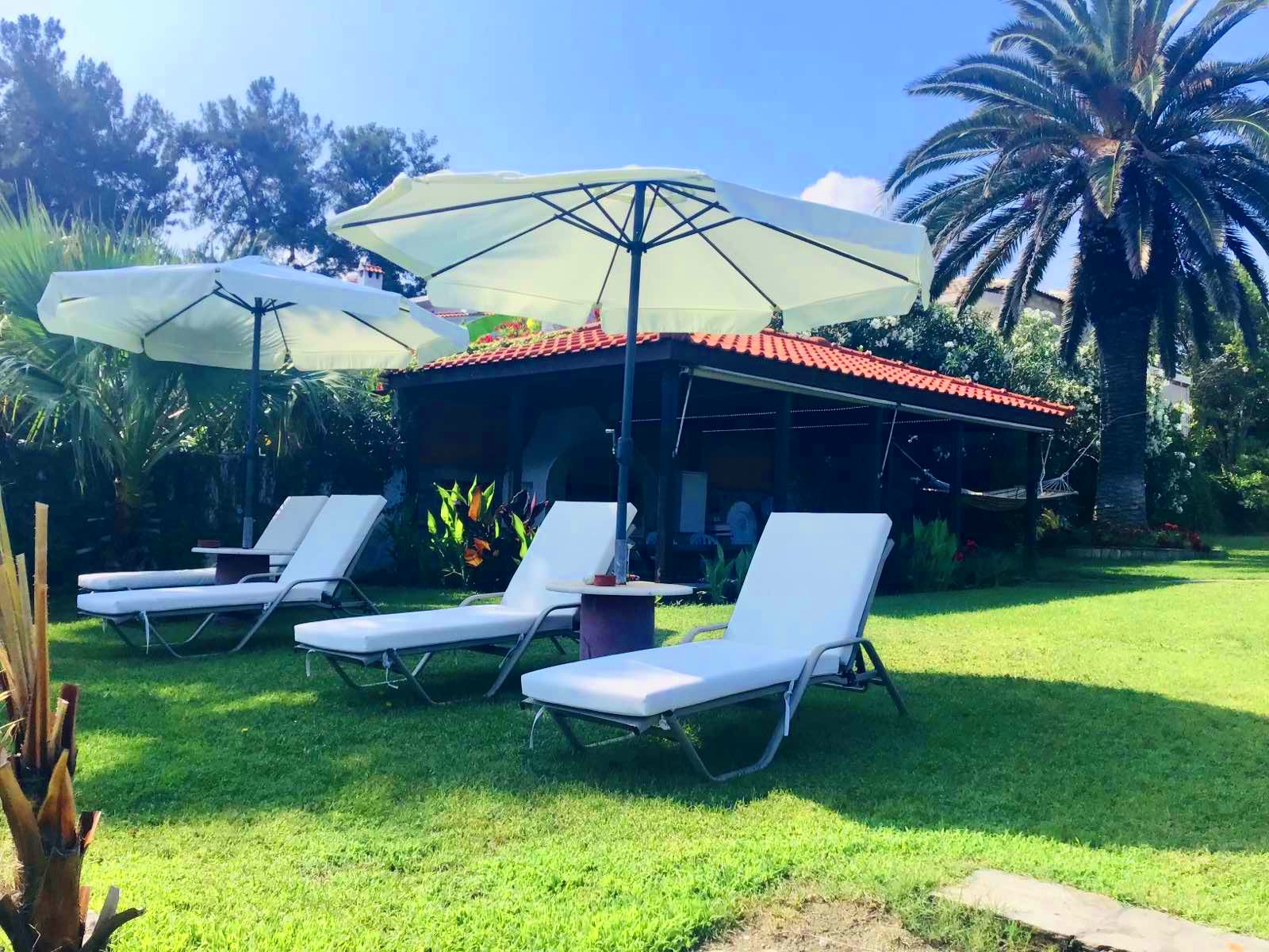 Experience the tranquility of Halkidiki’s coastline at Villa Alta Vista, where serenity meets natural beauty. Villa Alta Vista sits on a 1000-square-meter plot surrounded by a large garden with its own private umbrellas and sunbeds next to our two majestic palm trees. Available for your rental now, providing unique sea views and tranquility.